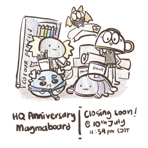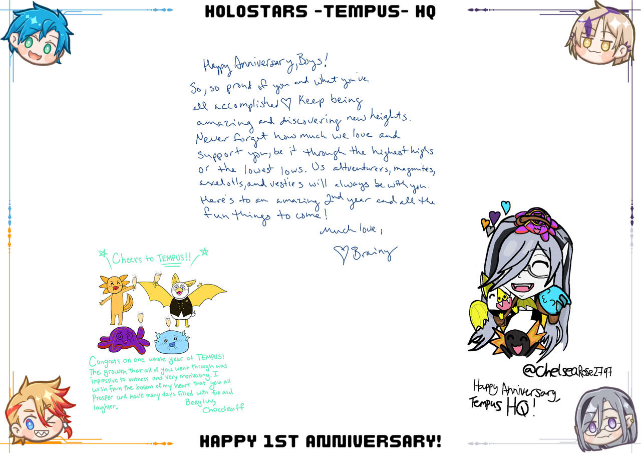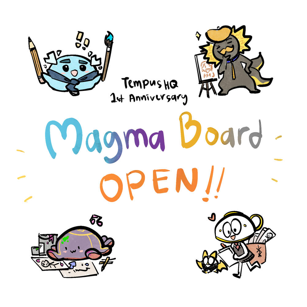 Happy First Anniversary, TEMPUS HQ!Tempuras all around have collaborated together to bring this Magma artboard project for celebrating TEMPUS HQ's 1st Anniversary!We would like to thank you for all the streams, contents and fun times that all of you have been putting together for us throughout this one year in Holostars. Here's for another years of great times and events on the future!